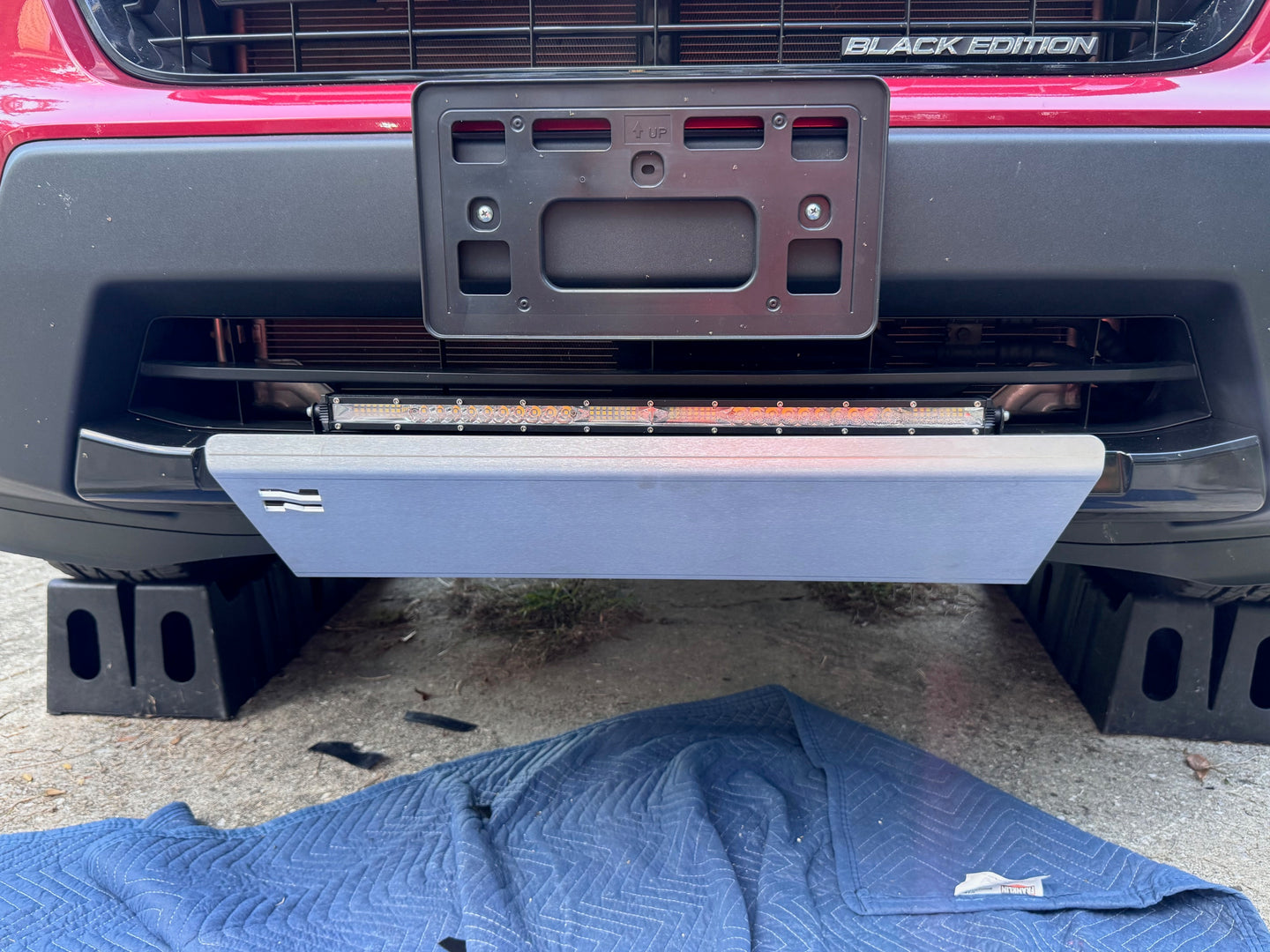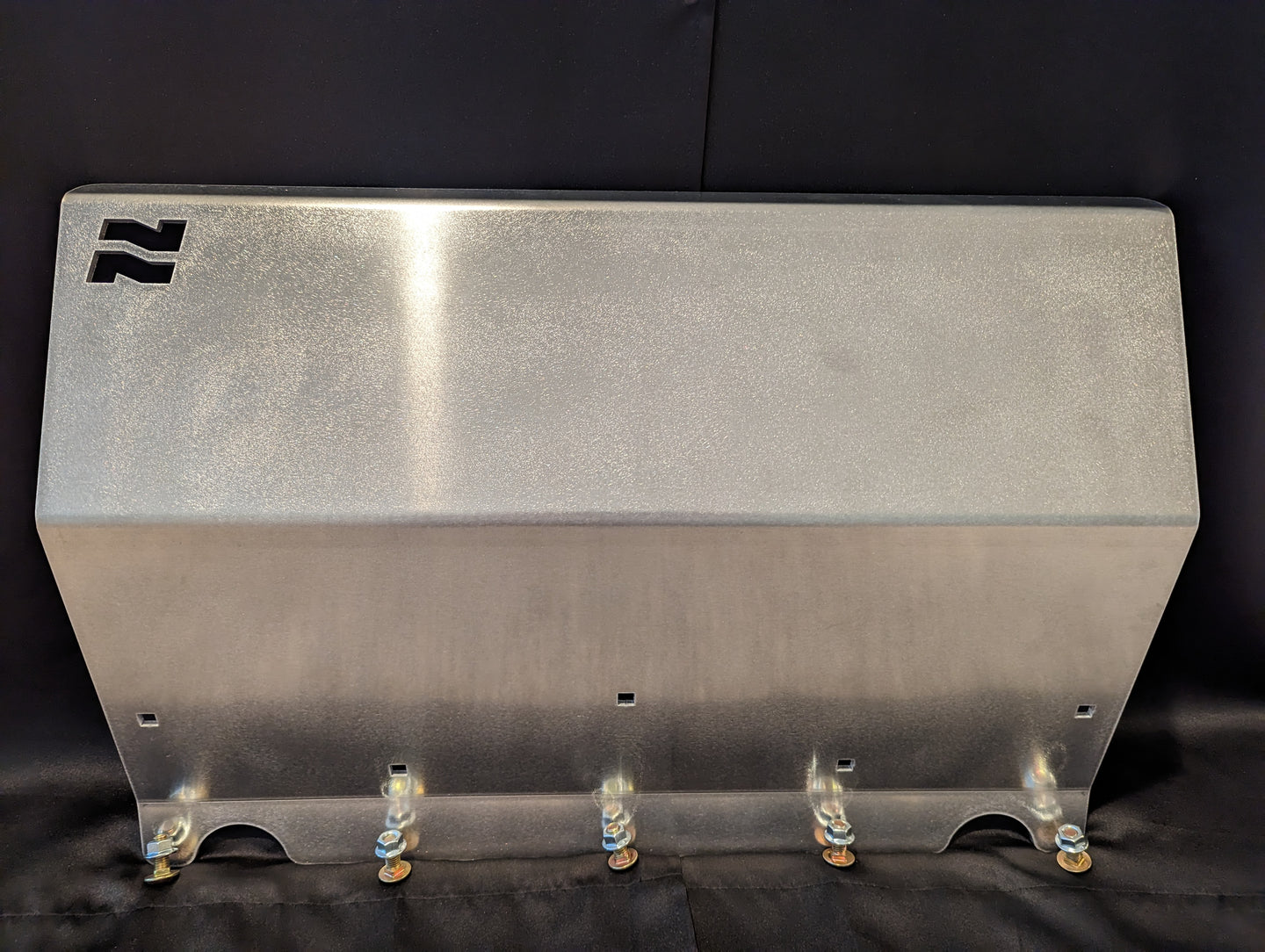 Plate is made of 3/16" 5052 raw aluminum, and is mounted directly to the front skid plate using 5 carriage bolts. Product is designed to fit tightly up against front bumper, which in some cases may require removing the lower bumper trim.